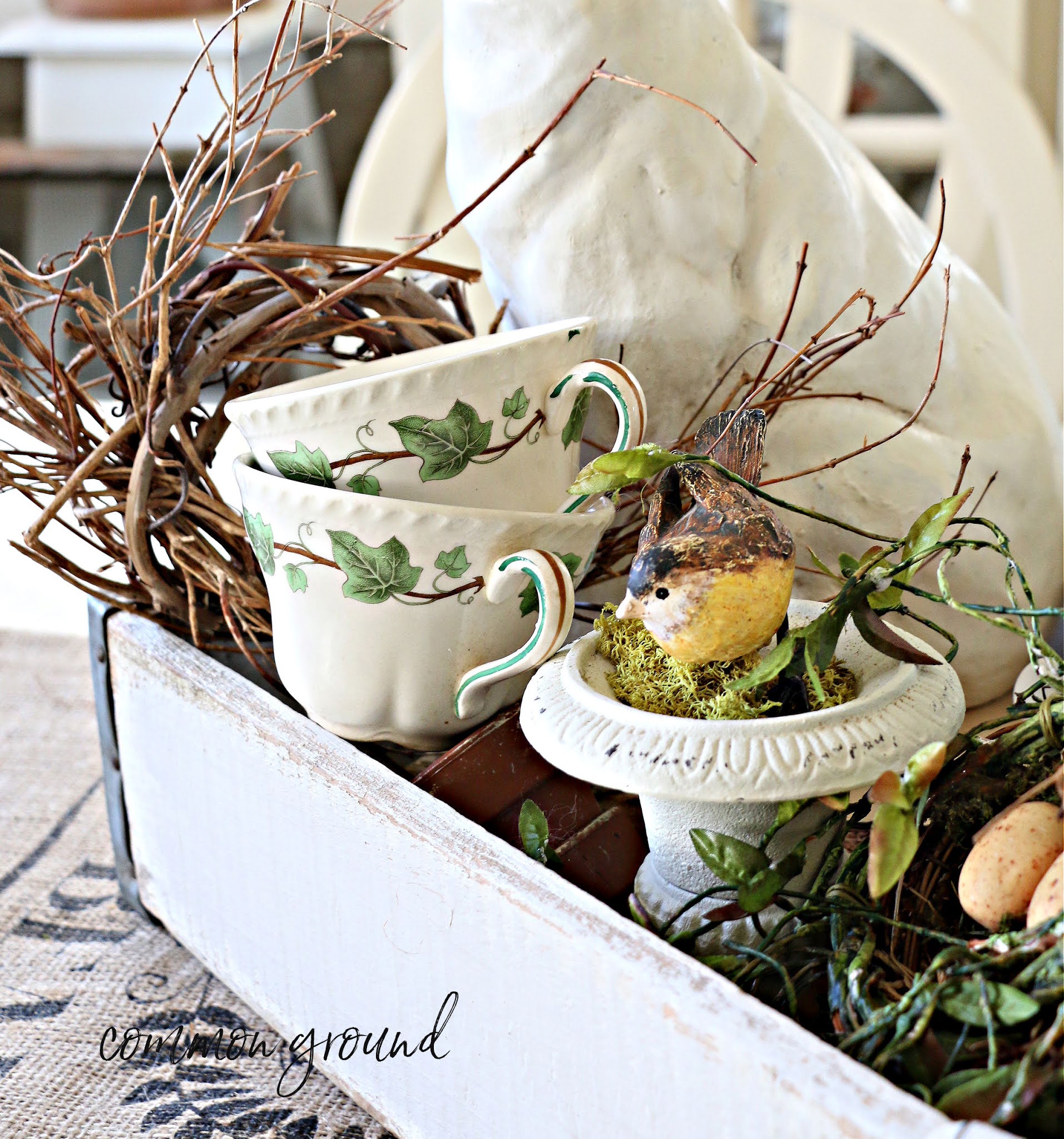 I filled up my wooden ice cream bucket last month with faux narcissus, pussy willows, and some mossy sticks. I knew I would use that combination in the bucket for at least a couple of months during early Spring. I also changed up my table linens I was using as a layered runner that I had used during "winter". I changed it for a caramel colored grainsack on top of a nubby linen tablecloth folded in half lengthwise (one of my fun tablerunner hacks)
