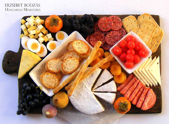 Last summer I found a neat charcuterie set for Tasha. I asked her to bring it so that we could set up hors d'oeuvres. Little did she know that soon, she would be opening a perfect 1/12th scale charcuterie board made by Erzsebet Bodzas of Hungarian Miniatures!