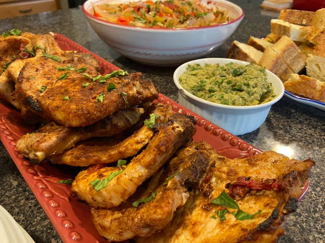 | Sheet Pan Pork Chops and Veggies, Tapenade and bread for mouth cooling. |