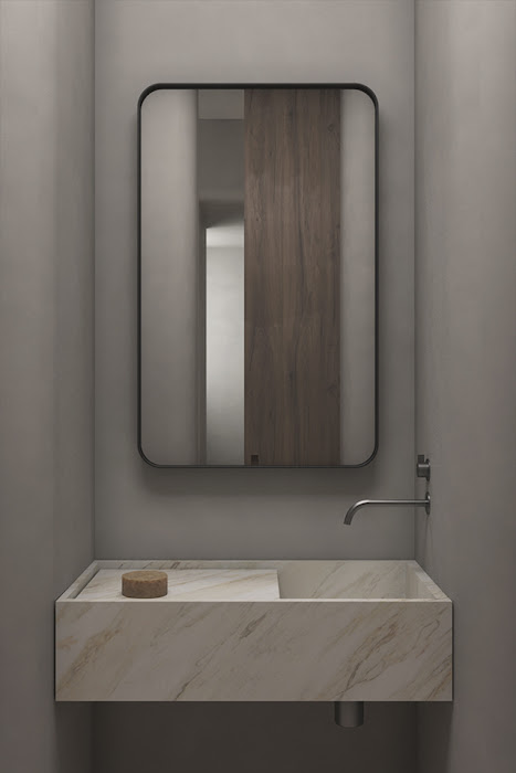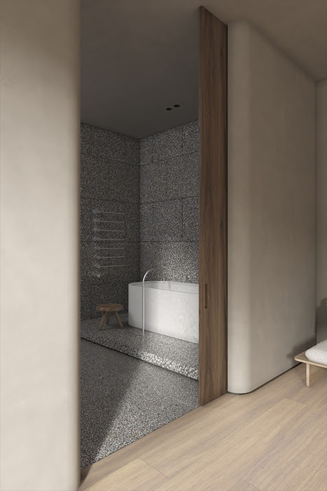 Distinct from the muted hues in the shared spaces, the bathroom becomes a unique zone, clad in textural grey terrazzo. The PB bath designed by Piet Boon for COCOON and the large bespoke marble sink provides a striking contrast. The Tabouret Berger stool is designed by Charlotte Perriand for Cassina and the towel warmer is by Vola.