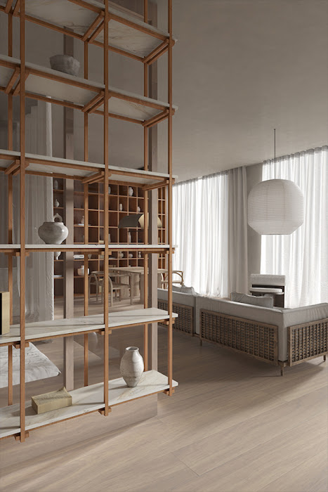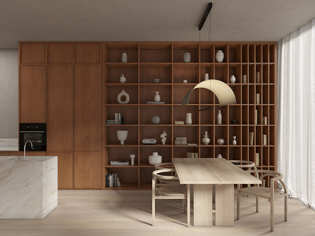 Minimal Arch chairs designed by South Korea-based studio Finder continue the lines of the lamp with their rounded shapes. The Monarch Shiitake Dining Table is made using traditional Chinese butterfly joinery to avoid the involvement of nails or screws, expressing the emerging imperfection of natural materials. The kitchen and bookshelves are made of cherry wood, while shallow niches are decorated with sculptural ceramics and objects.