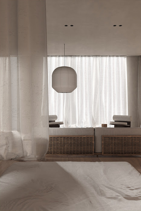 In the living room, the homeowners love for traditional Japanese lamps is reflected in the use of the Hotaru Buoy pendant light by TwentyTwentyone, which provides a soft diffused light. The Belle Reeve sofa by De La Espada represents the perfect unison of traditional craft with an enduring aesthetic that is as modern as it is timeless. The studio's minimalist approach is evident throughout the clutter-free open space.
