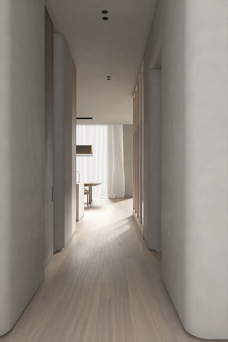Kyiv-based architecture and interior design studio Men Bureau have designed a quiet and cosy home with a minimalist Japanese inspired aesthetic. Using predominantly warm-coloured wood and plaster, the materials selected reflect the client’s preferences for natural finishes and a need for durability and longevity. Circles and arks have been used to soften the spaces, while the addition of rounded corners to various areas of the internal spaces provide visual comfort.