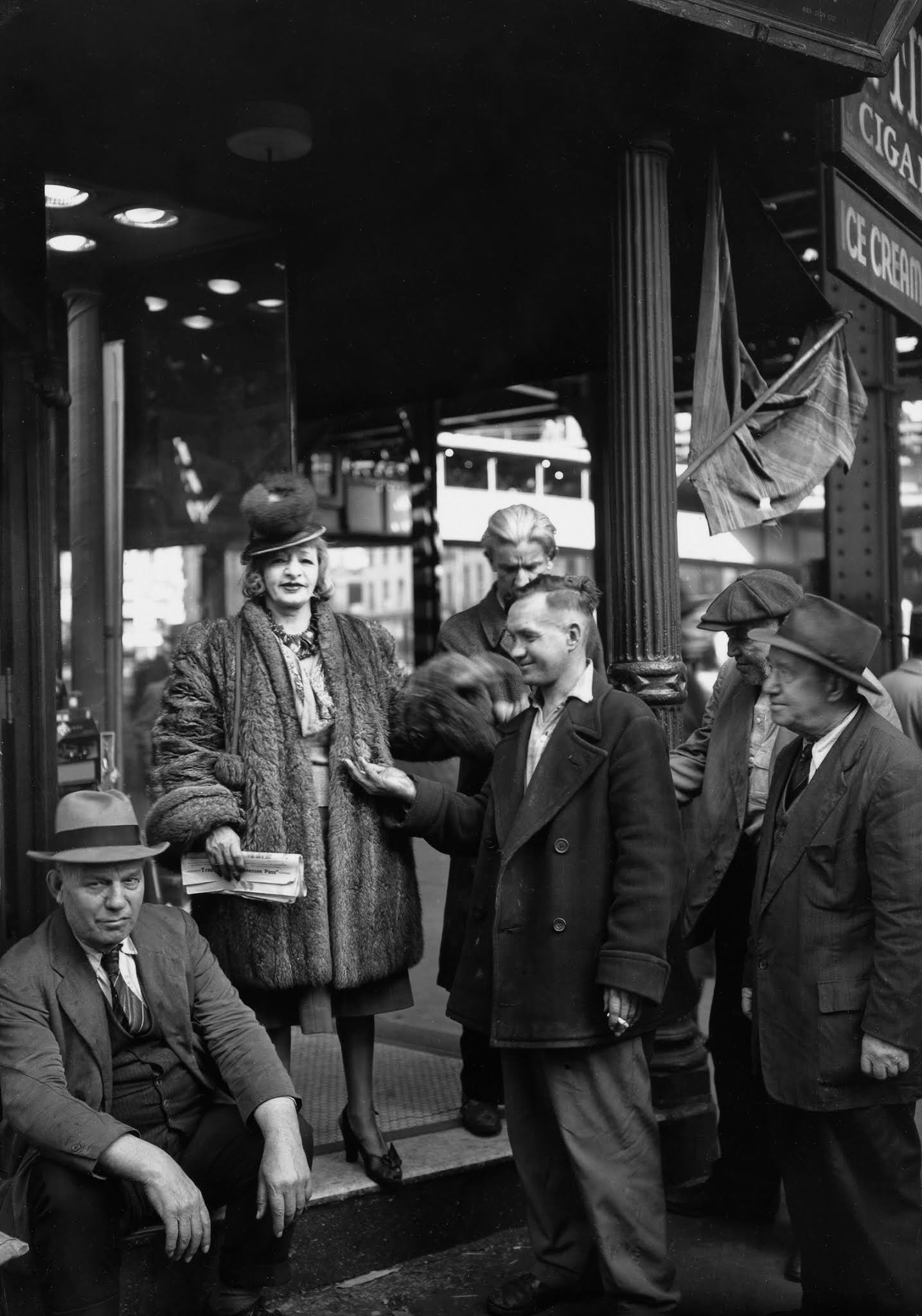 The Venice is a family enterprise. It is owned by Mazie and two sisters—Rosie, the widow of a horse-race gambler, and Jeanie, an acrobatic dancer. Mazie’s sisters do not often show up at the Venice and she runs things to suit herself. She is profoundly uninterested in moving pictures and is seldom able to sit through one. “They make me sick,” she says. Consequently, she employs a manager and leaves the selection and ordering of films entirely up to him. For a theatre of its class, the Venice is prosperous, and Mazie could afford to hire a ticket girl and take things easy, but she enjoys the job and will not relinquish it, as her sisters often urge her to do. From her cage she has a good view of Chatham Square, which is the favorite promenade of Bowery drunks and eccentrics. “The things I see, by God, you wouldn’t believe it,” she says proudly. When she catches sight of a person she knows among the passers-by, she sticks her face up to the round hole in the front window of her cage and shouts a greeting. Sometimes she discusses exceedingly personal matters with people out on the sidewalk. “Hey there, Squatty,” she yelled one afternoon to a dreamy-eyed little man, “I thought you was in Bellevue.” “I was, Mazie,” the man said. “They turned me loose yesterday.” “Where’d they put you this time—the drunk ward or the nut ward?” “I was in with the drunks this time.” “How’d they treat you?” “They didn’t do me no harm, I guess.” “You get drunk last night, Squatty?” “Sure did.” “Guess you had to celebrate.” “Sure did.” “Well, take care yourself, Squatty.” “Thanks, Mazie. You do the same.”