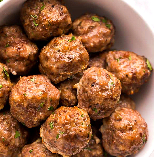 In a large bowl mix all of the ingredients, add cooled bacon last, handle as little as possible, and form into meatballs. Add a small splash of milk or stock if needed to help it hold together.